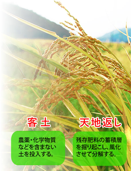 土壌の清浄化は、客土による緩和と天地返しの2通りの方法を行い、種の清浄化は、自家採種を繰り返すことで行います。